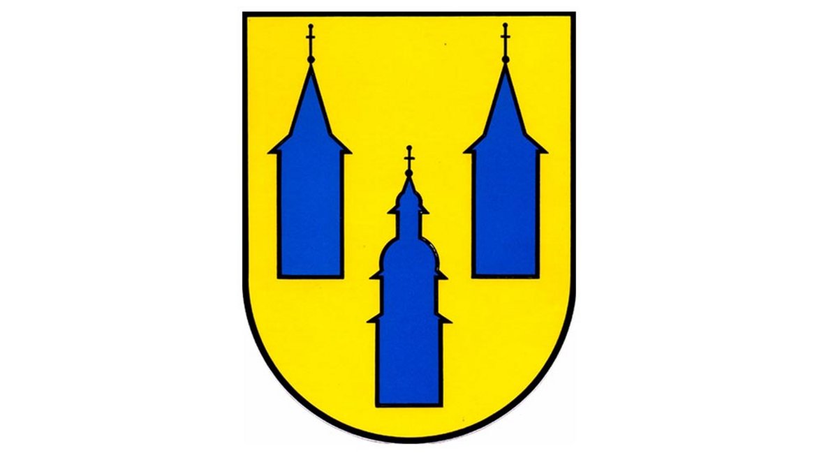 In Gelb drei blaue 2:1 gestellte Kirchtürme, die beiden oberen mit spitzem, der untere mit barockem Helm.