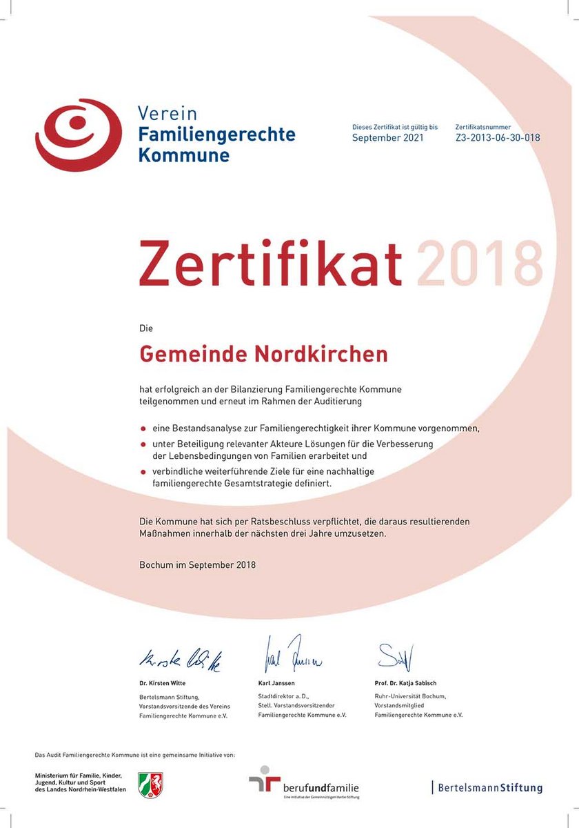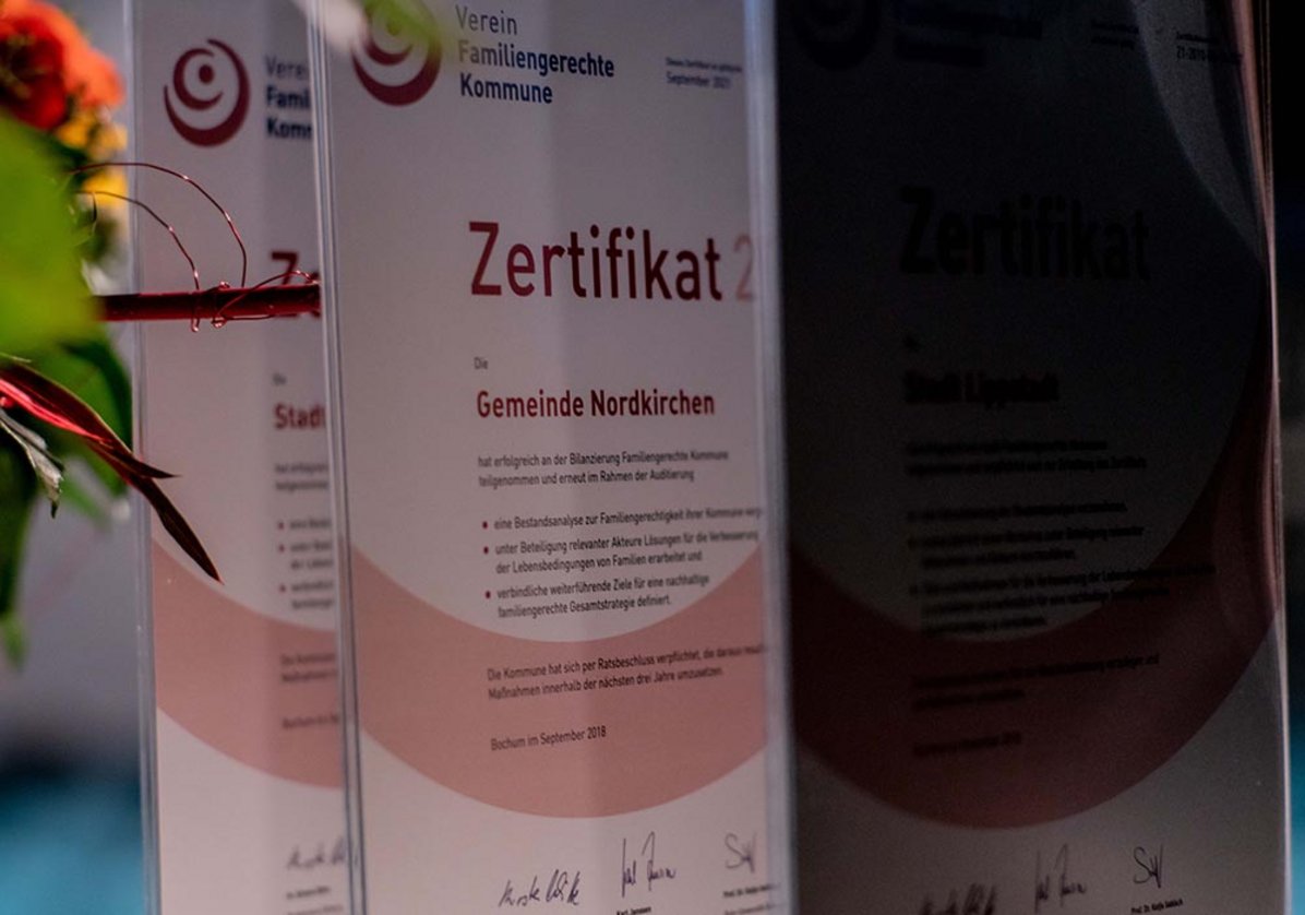 Dadurch erhielt die Gemeinde Nordkirchen im Juni 2013 erstmalig das Zertifikat „Familiengerechte Kommune“.