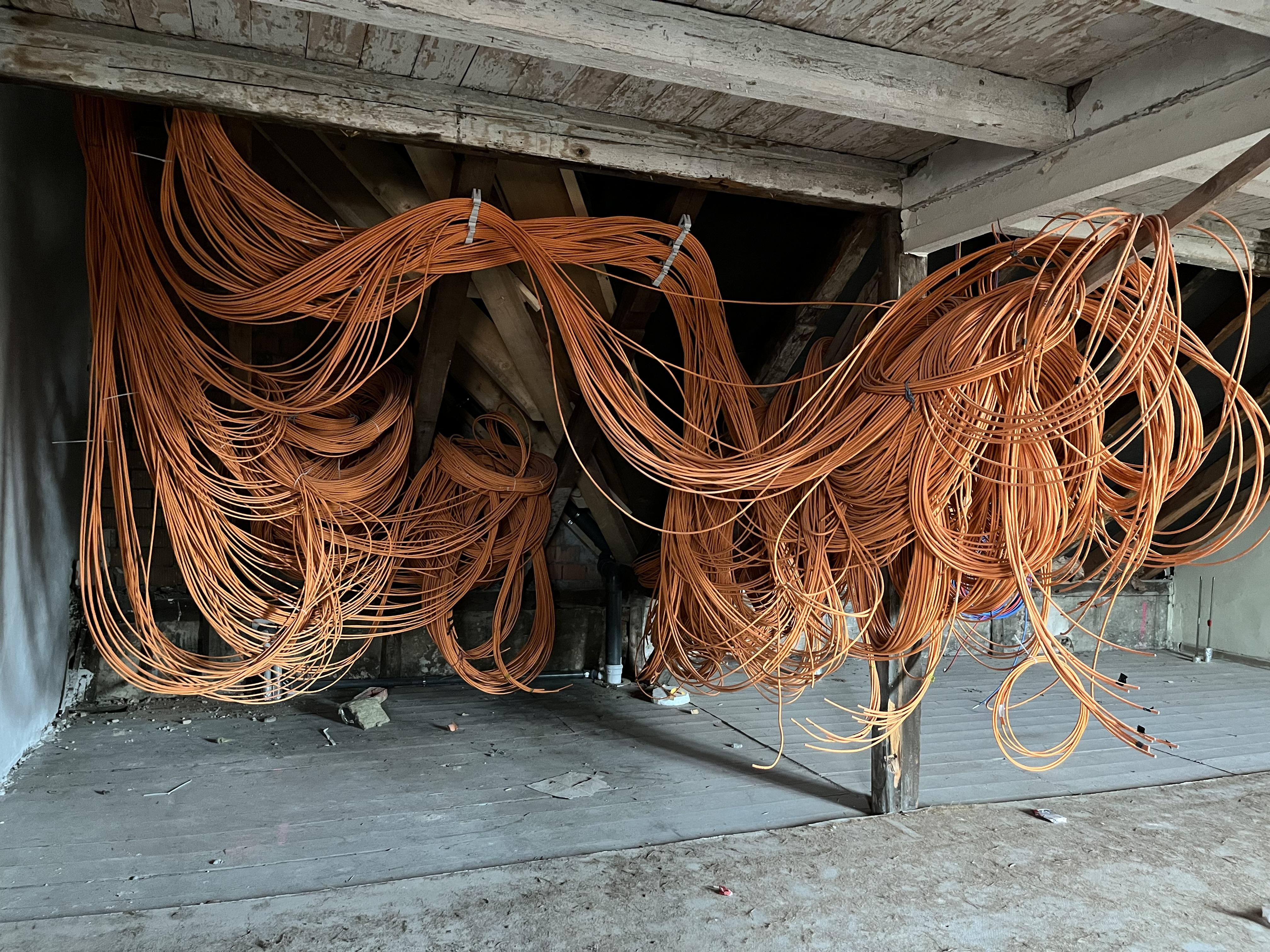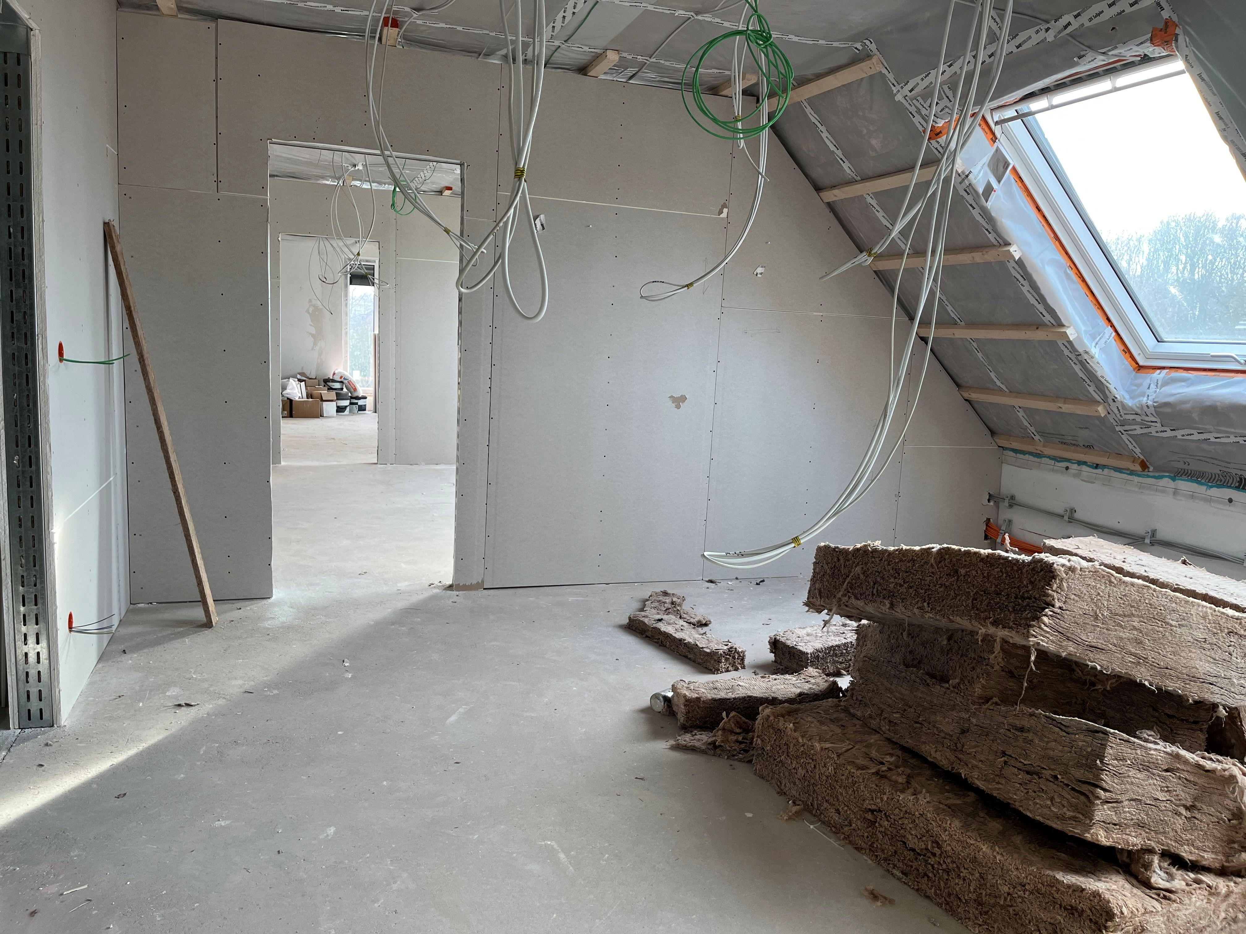Währenddessen haben die Arbeiter im Inneren schon ganze Arbeit geleistet und zahlreiche Kabel und Leitungen verlegt. Zurzeit werden die ersten Wände verputzt.