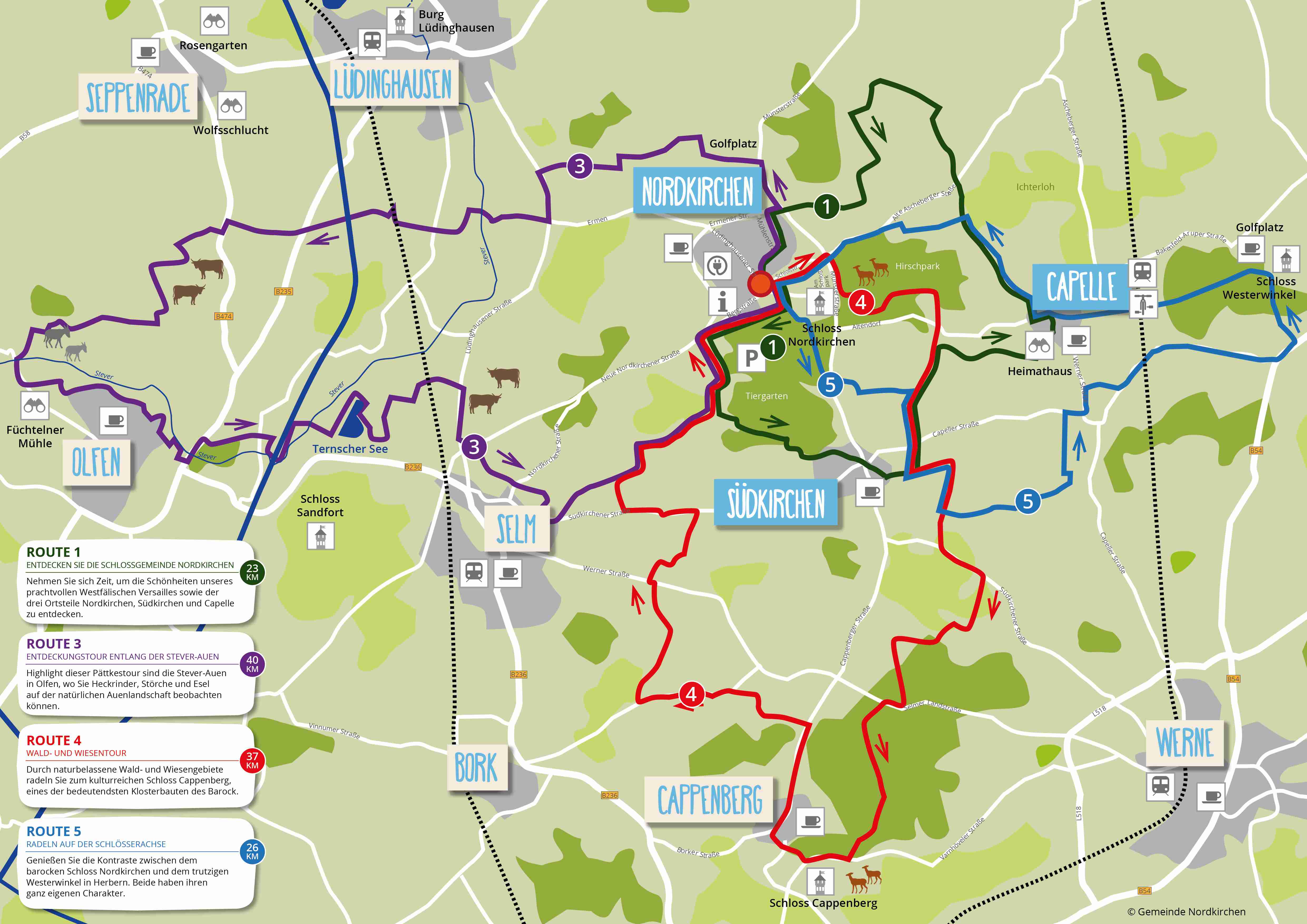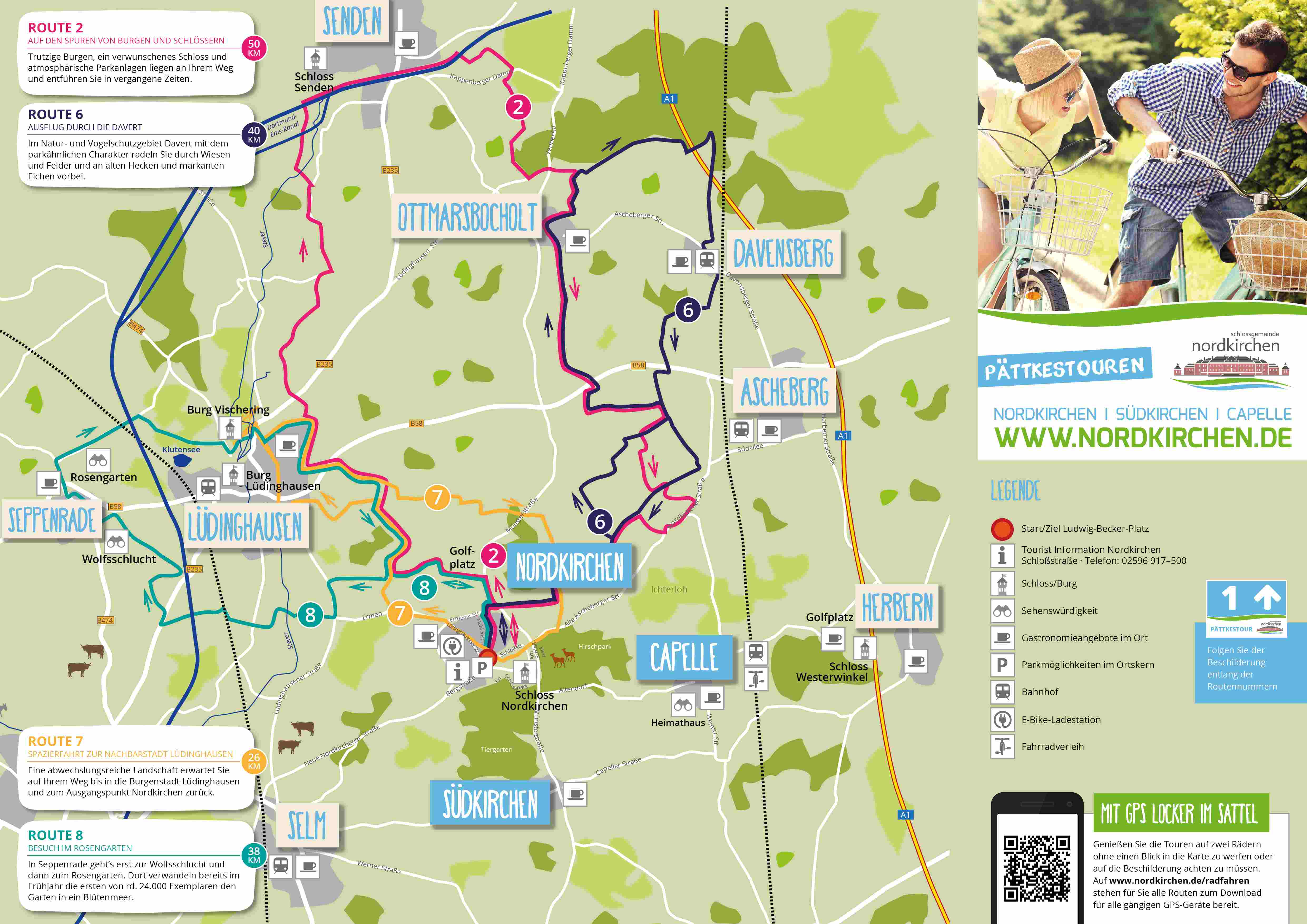 Schloss, Dorf und Natur gehen in Nordkirchen eine wunderbare Verbindung ein. Auf gut ausgeschilderten Radwegen, oder, wie der Westfale sagt, auf Pättkes, fahren Sie herrlich leicht an üppigen Feldern und Wiesen, verwunschenen Gärten, historischen Wasserschlössern und Burgen vorbei.