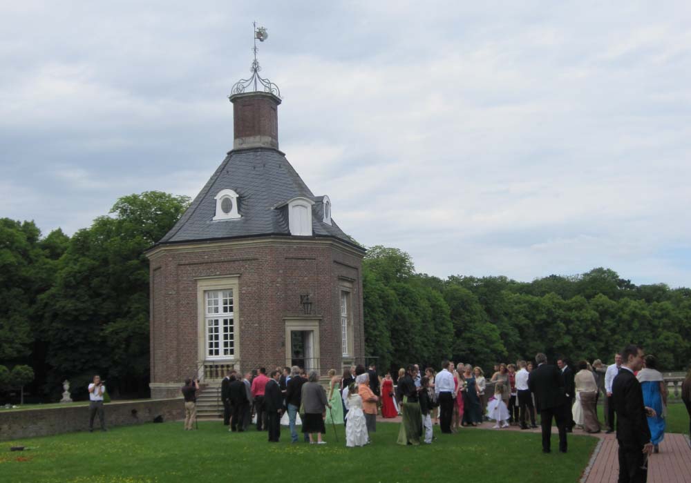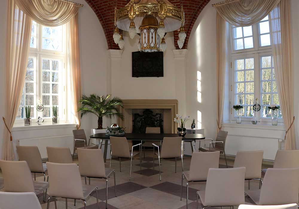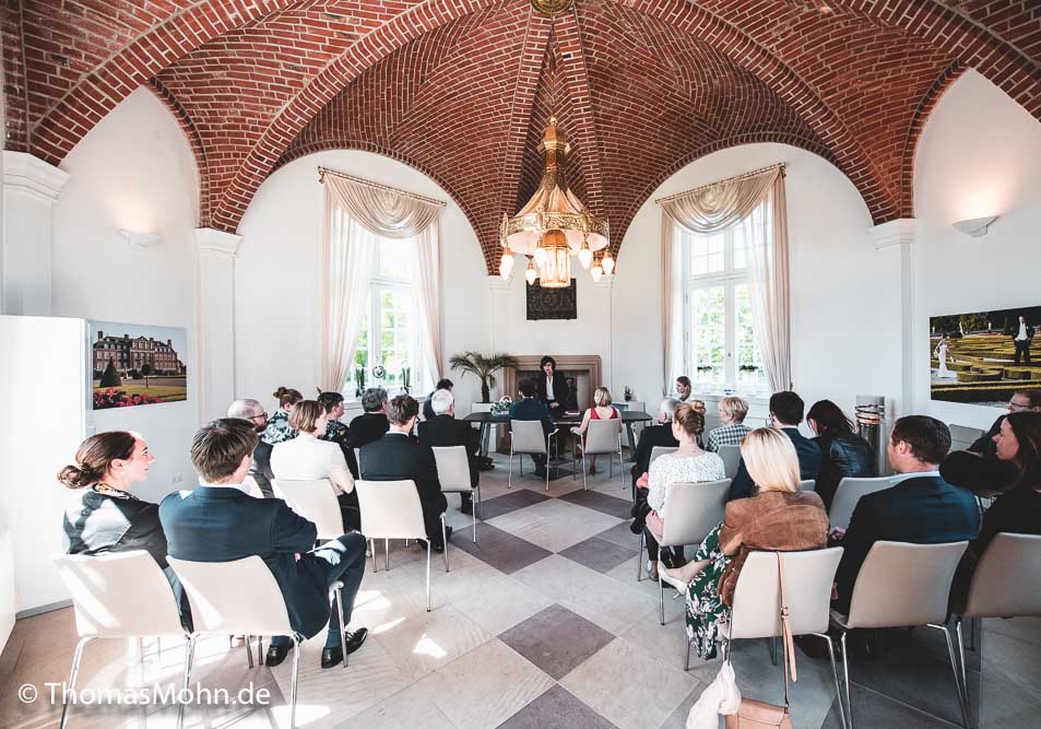 Wählen Sie für Ihre romantische Trauung das „Hochzeitstürmchen" des Wasserschlosses. Das Hochzeitstürmchen ist mit 24 Stühlen bestückt. Bis zu 15 weitere Gäste können an der Trauung teilnehmen, müssen allerdings mit einem Stehplatz vorliebnehmen.