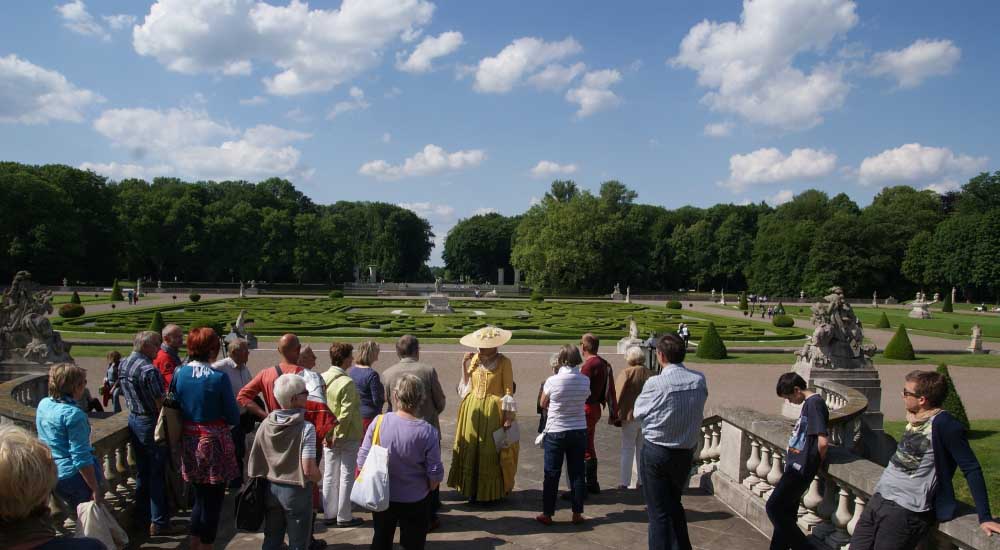 Die erfahrenen und selbstständig tätigen Gartenführerinnen wandeln mit Ihnen unter anderem auf den Spuren der bedeutenden Gartenarchitekten Johann Conrad Schlaun, Maximilian Friedrich Weyhe und Achille Duchene. Auch die vielen Nebengebäude des Schlosses, z. B. die Orangerie, die Fasanerie und die Oranienburg werden entdeckt.