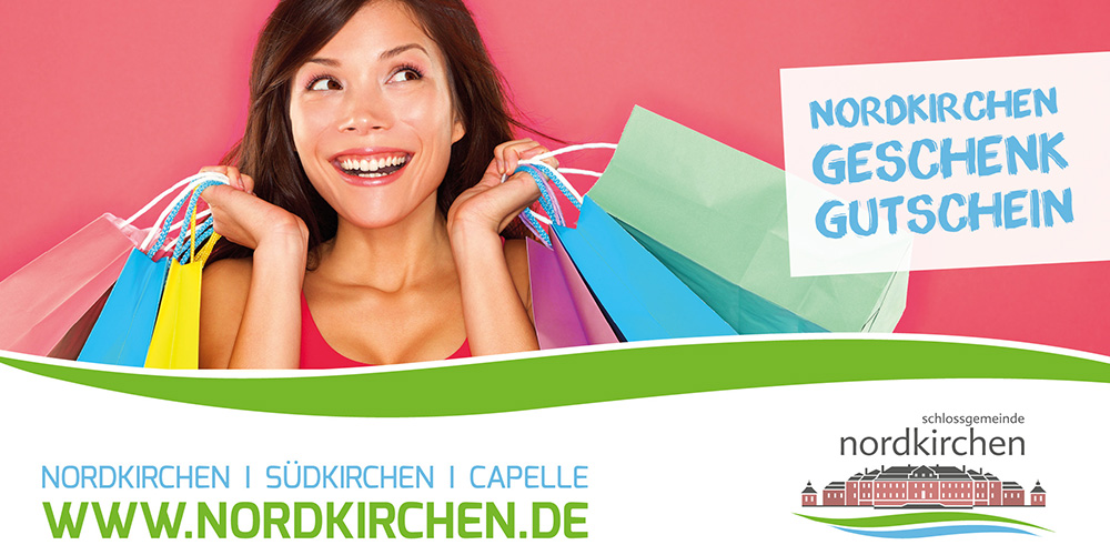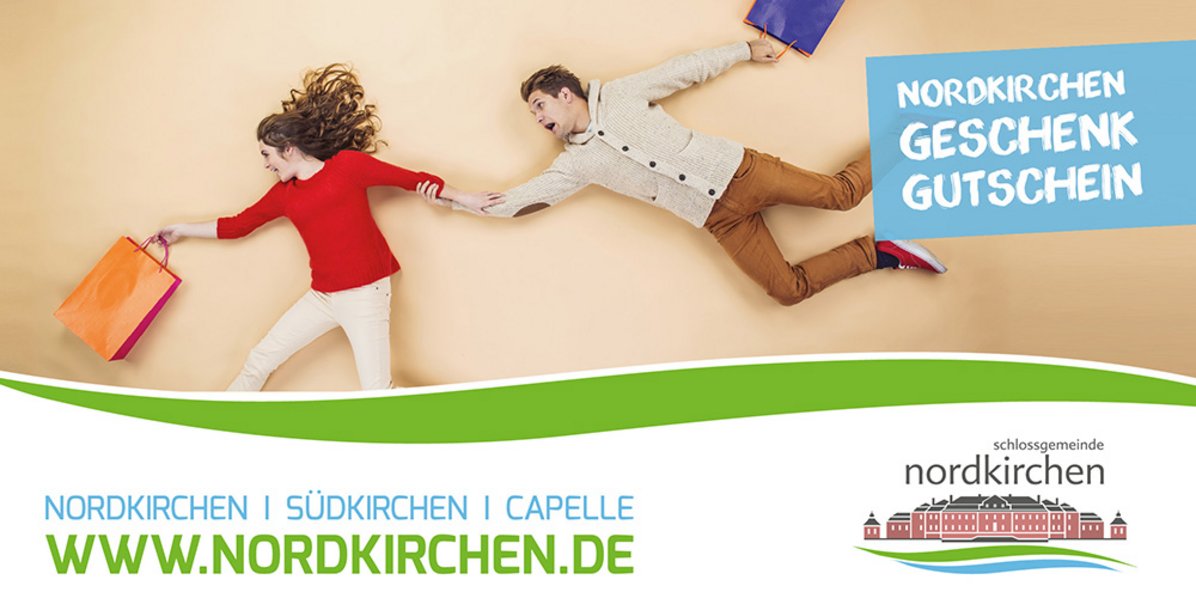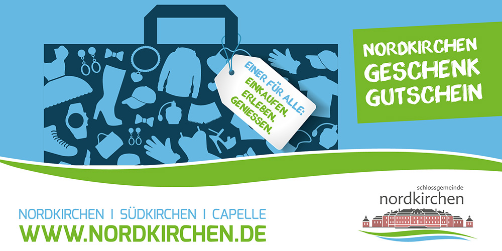 Der Nordkirchengutschein ist ein Gemeinschaftsgutschein der Gemeinde Nordkirchen und örtlicher Unternehmen. Der Gutschein lässt den Beschenkten die freie Wahl, wann und aus welchem Angebot sie sich ihren persönlichen Wunsch erfüllen.